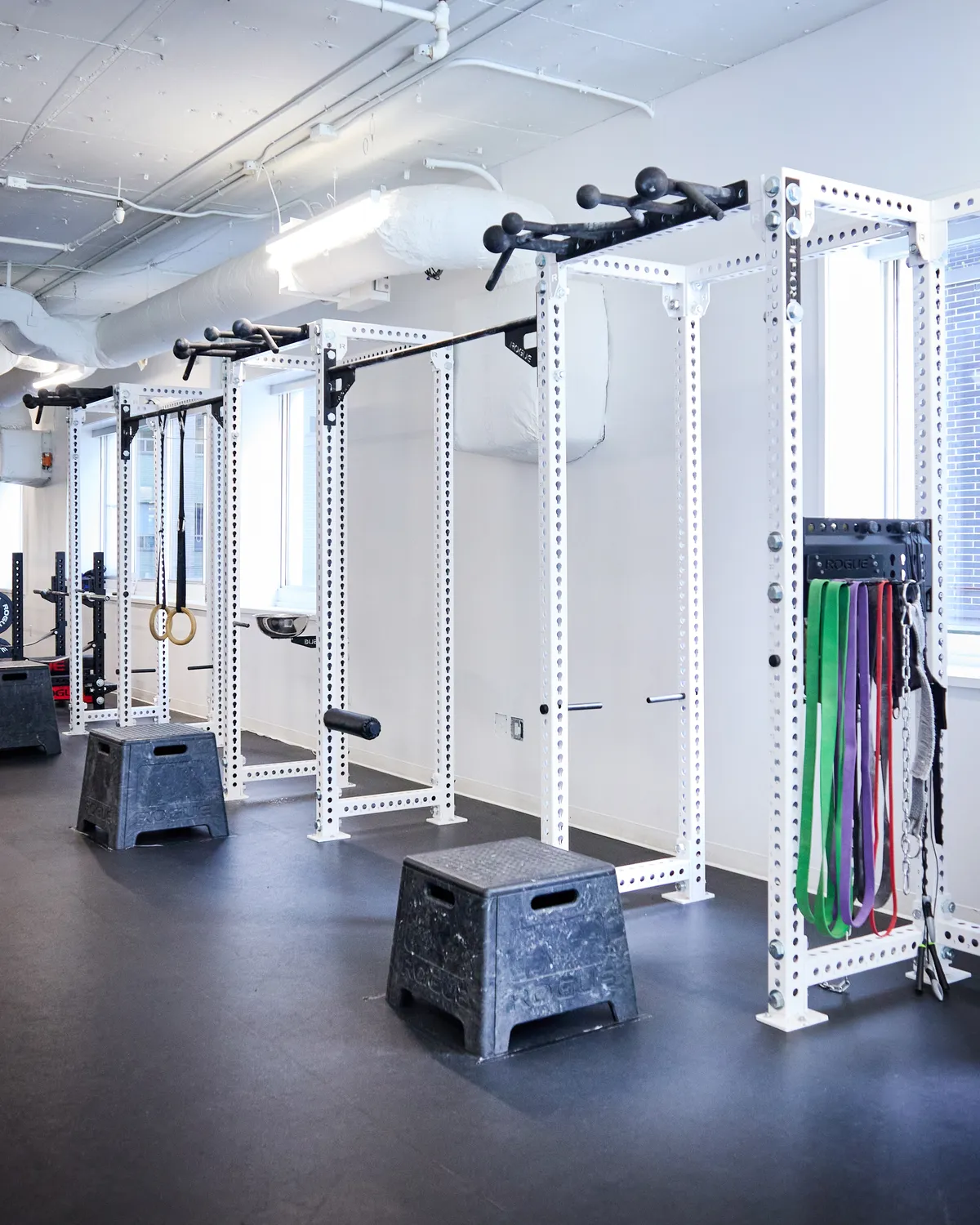 Fit Squad is fully equipped for almost any Crossfit workout. 45, 35, 25lbs bars, axel bars, farmer's carry handles, 2–120 lbs dumbbells, most in multiple pairs, 8–48 kg kettlebells, also in multiple pairs, several pull up rigs of different heights, wallballs and wallball targets, light to heavy sandbags, high and low gymnastics rings, olympic weightlifting platform, plenty of squat racks, 90 ft turf with multiple sleds, Assault Runner, Rower, Bike and Ski ergs by Concept 2, Echo bike by Rogue and more. The only real limitation is height of the ceiling, which doesn't allow us to hang full-length climbing rope. But you can still do your bar and ring muscle ups.
